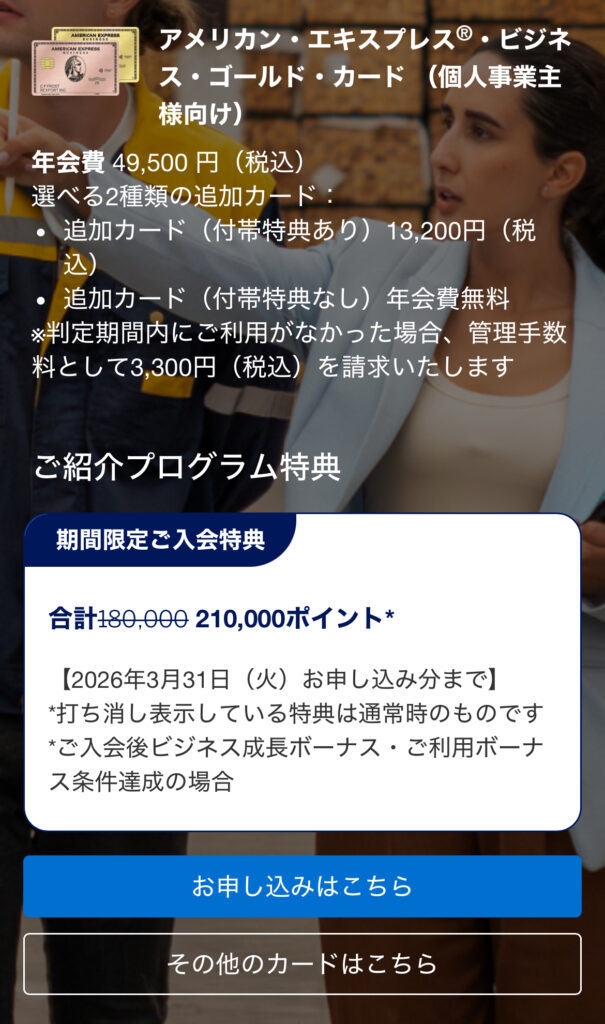 AMEXビジネス・ゴールド・カードの2026年2月現在の入会キャンペーンは、最大21万ポイントがもらえる豪華な内容となっています。