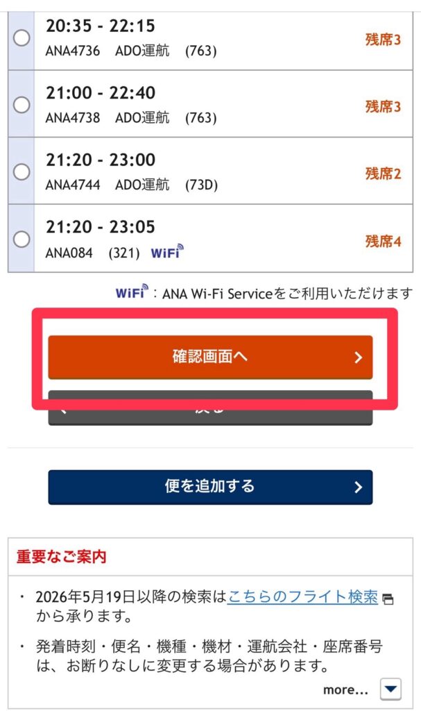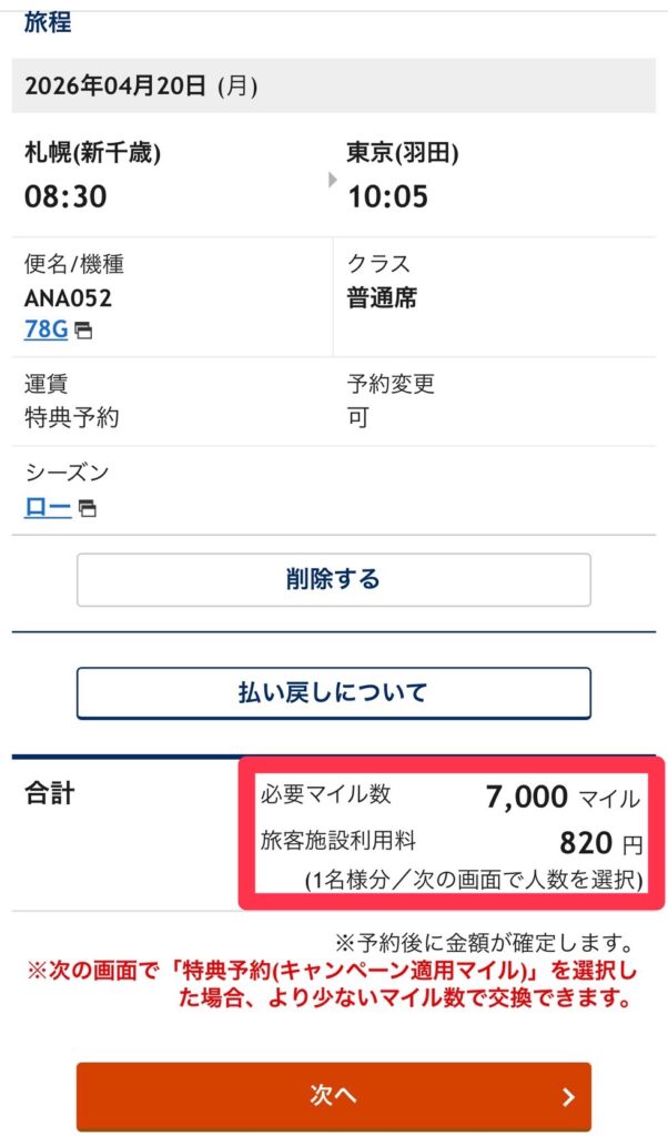 7️⃣必要マイル数と、旅客施設利用料を確認して次へ