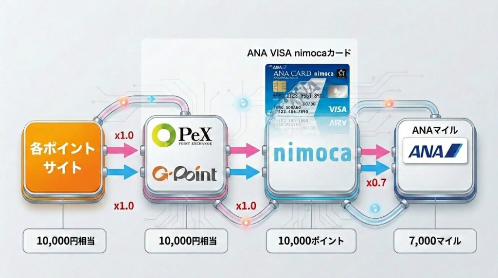 | 中継サイト | 交換日数(nimocaへ) | 手数料 | 最終的なANAマイル交換率 |