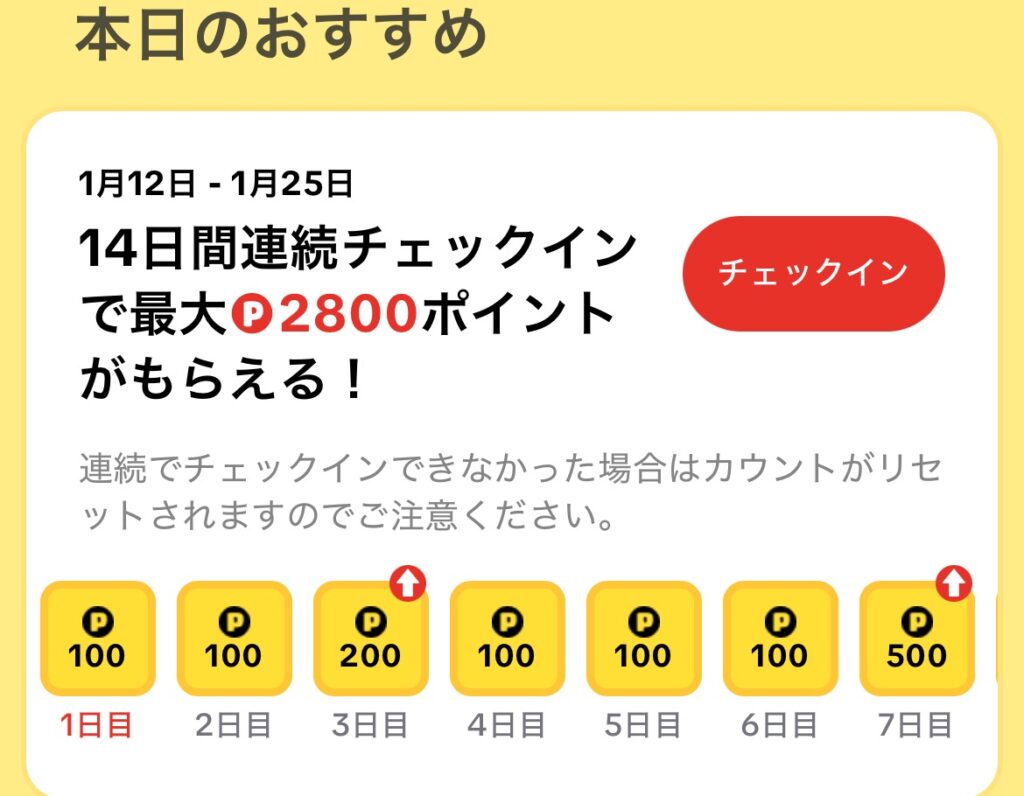 このチェックインボタンが、押したつもりで押されていなかった💦ということが私はあったので、アプリを開いた後、必ず「チェックイン」ボタンを押してください!